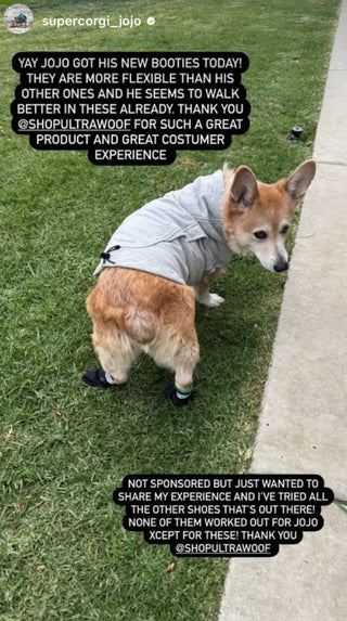 These Ultrawoof boots have a flexible sole which helps dogs feel the ground beneath them, making it more natural to wear. They are also lightweight which helps keep the dog comfortable. The reflective velcro straps at the leg have stretch and can be tightened or loosened based on your dog's leg circumference.