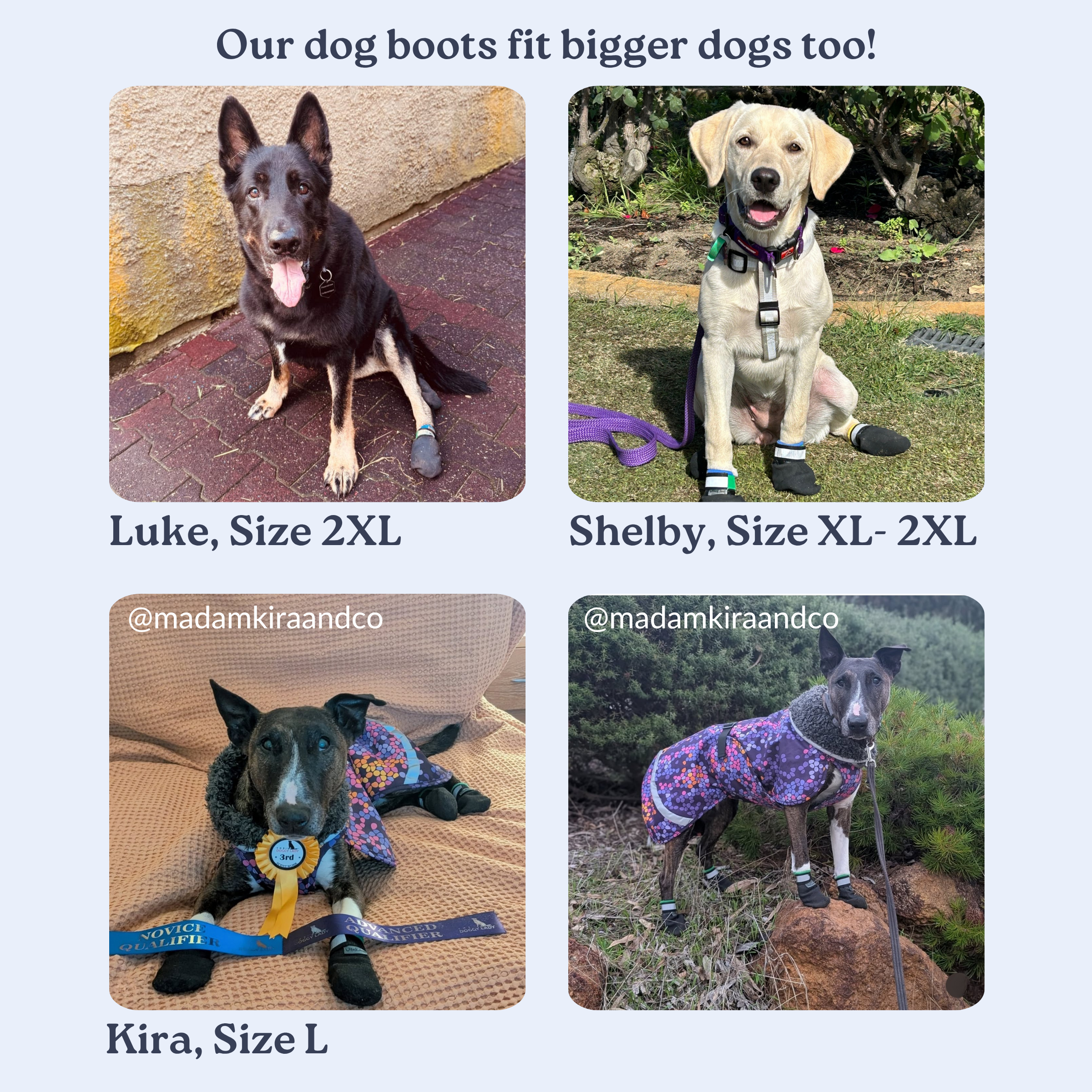 If your dog needs a smaller size, check out our All Season Dog Boots or the ComfyToes All Season Dog Boots for Small Dogs.