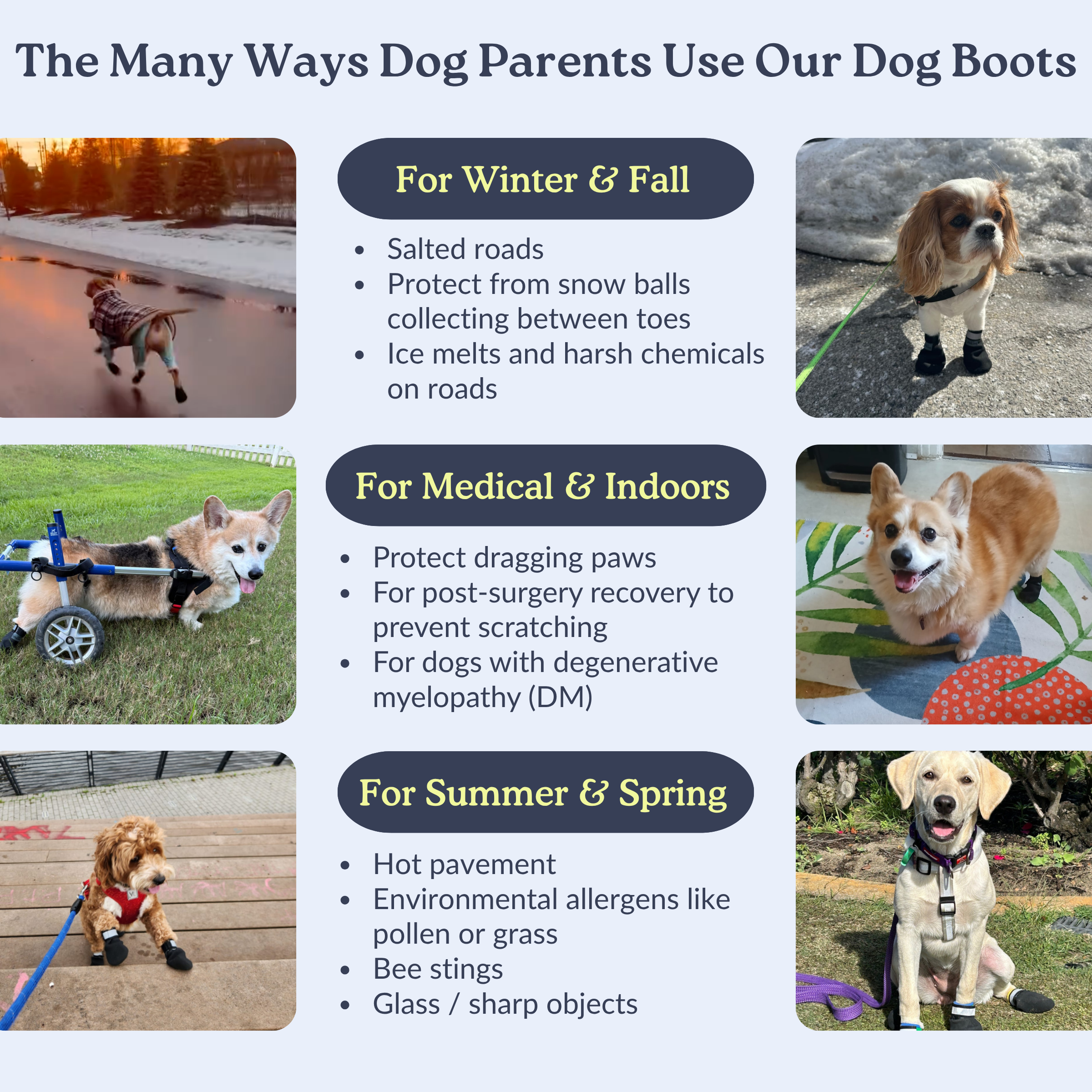 Yes! When necessary, putting dog boots on your dog will help keep their paws protected from hot pavement and burns in the summer, and frostbite and discomfort in the winter. Some pet parents use our dog shoes to avoid blisters, scrapes, and paw pad injuries from playing on gravel or pavement.